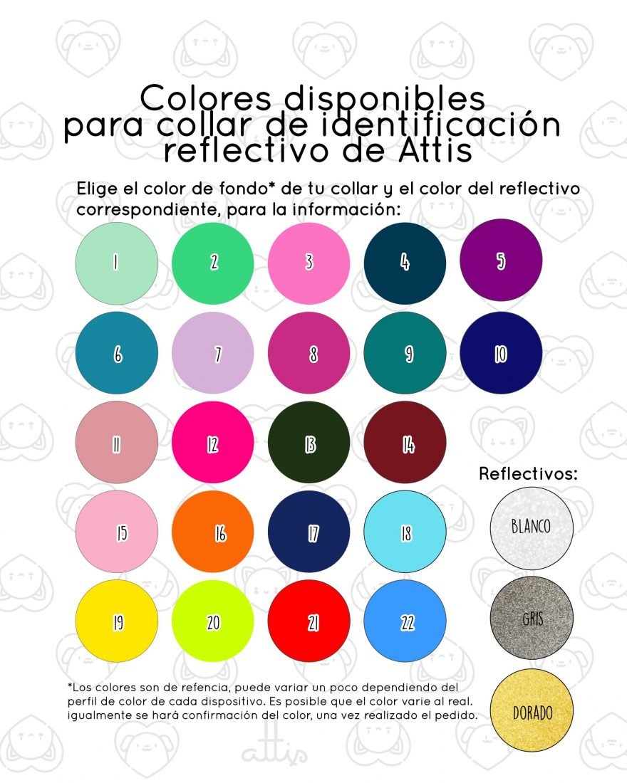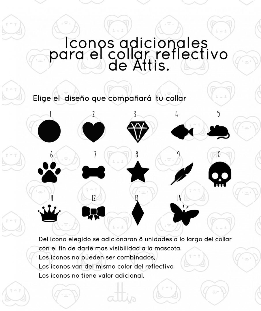 Puedes escoger el color de fondo, color reflectivo de las letras y algunos iconos que adornaran el collar.