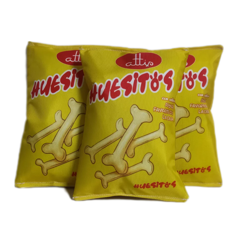 Nuestros peluches para perros son de calidad de lona de morral, tienen traen relleno sintético y una capa reciclada para que produzcan un sonido de paquete de papas.
